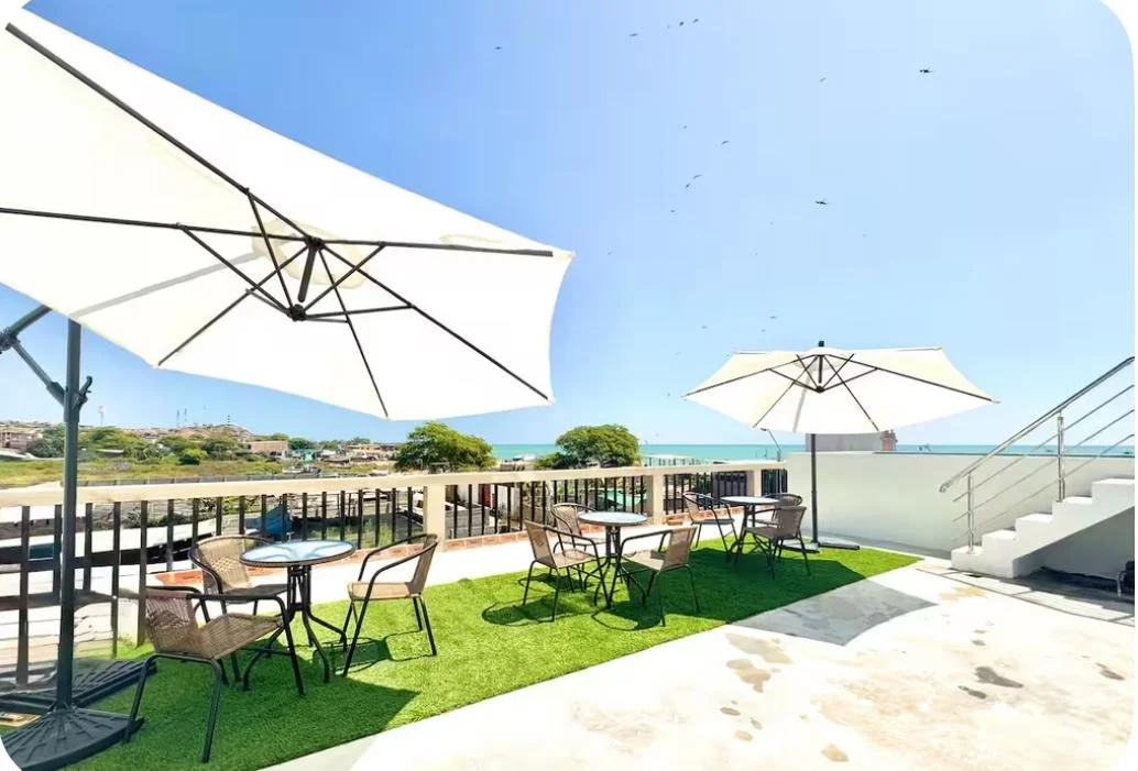 *Terraza con piscina vista al mar, mesas, reposeras y sombrillas.